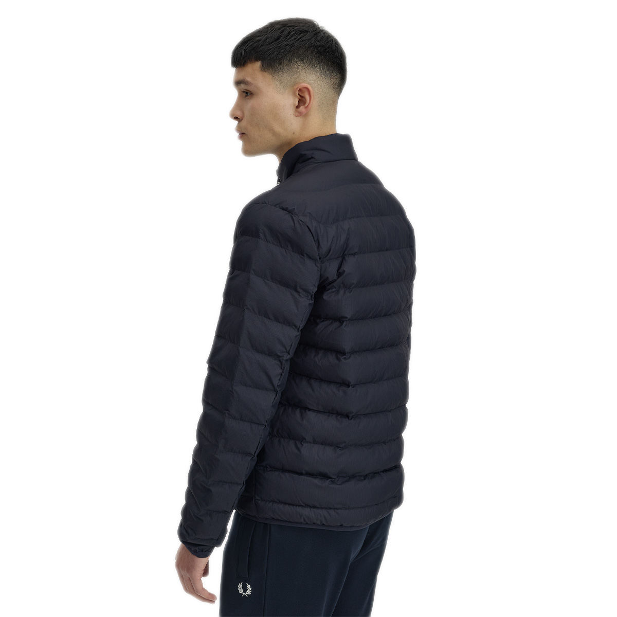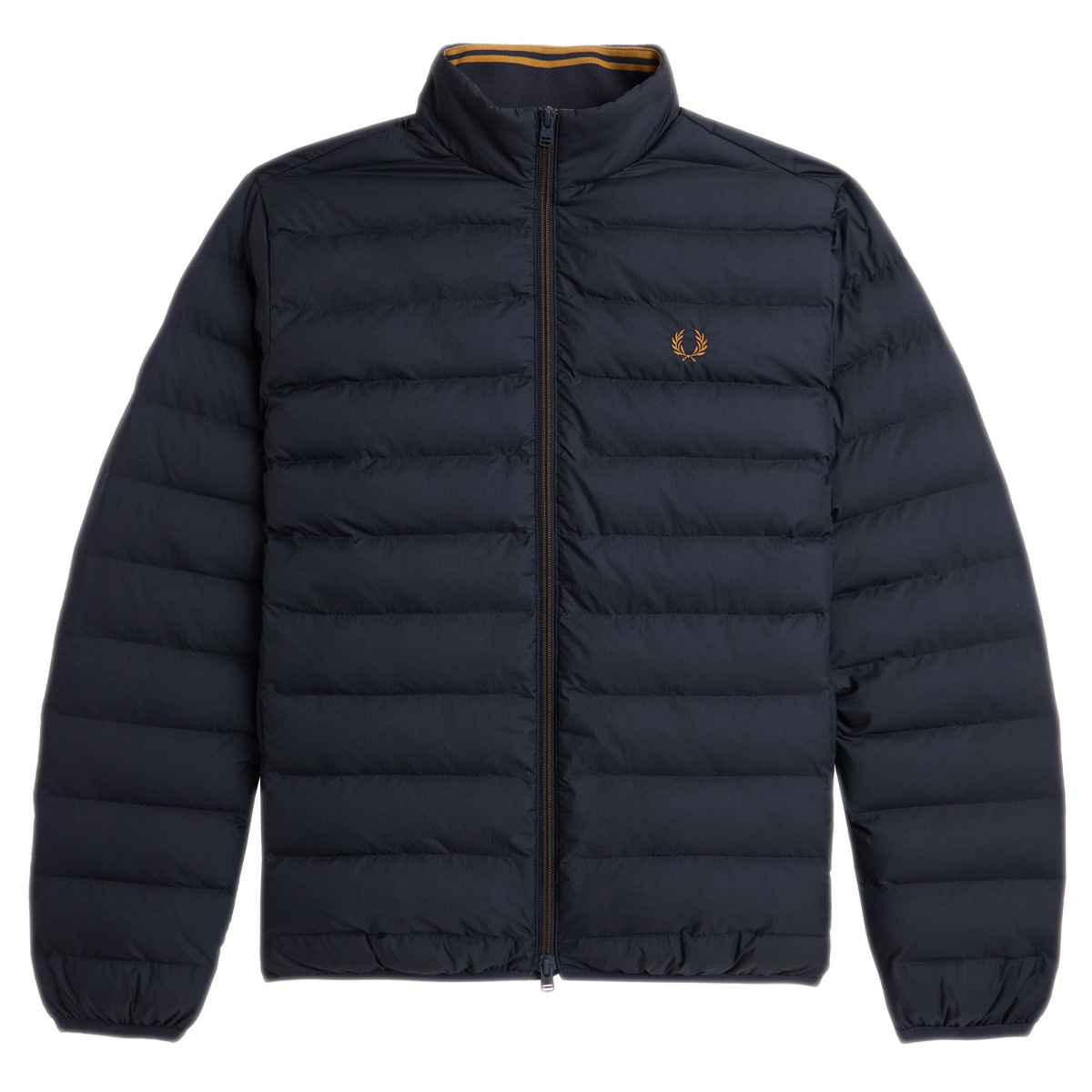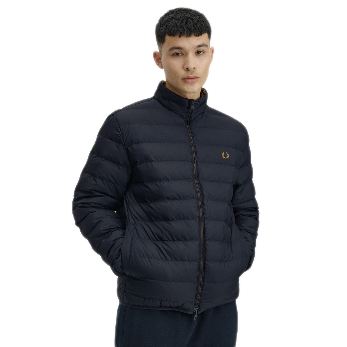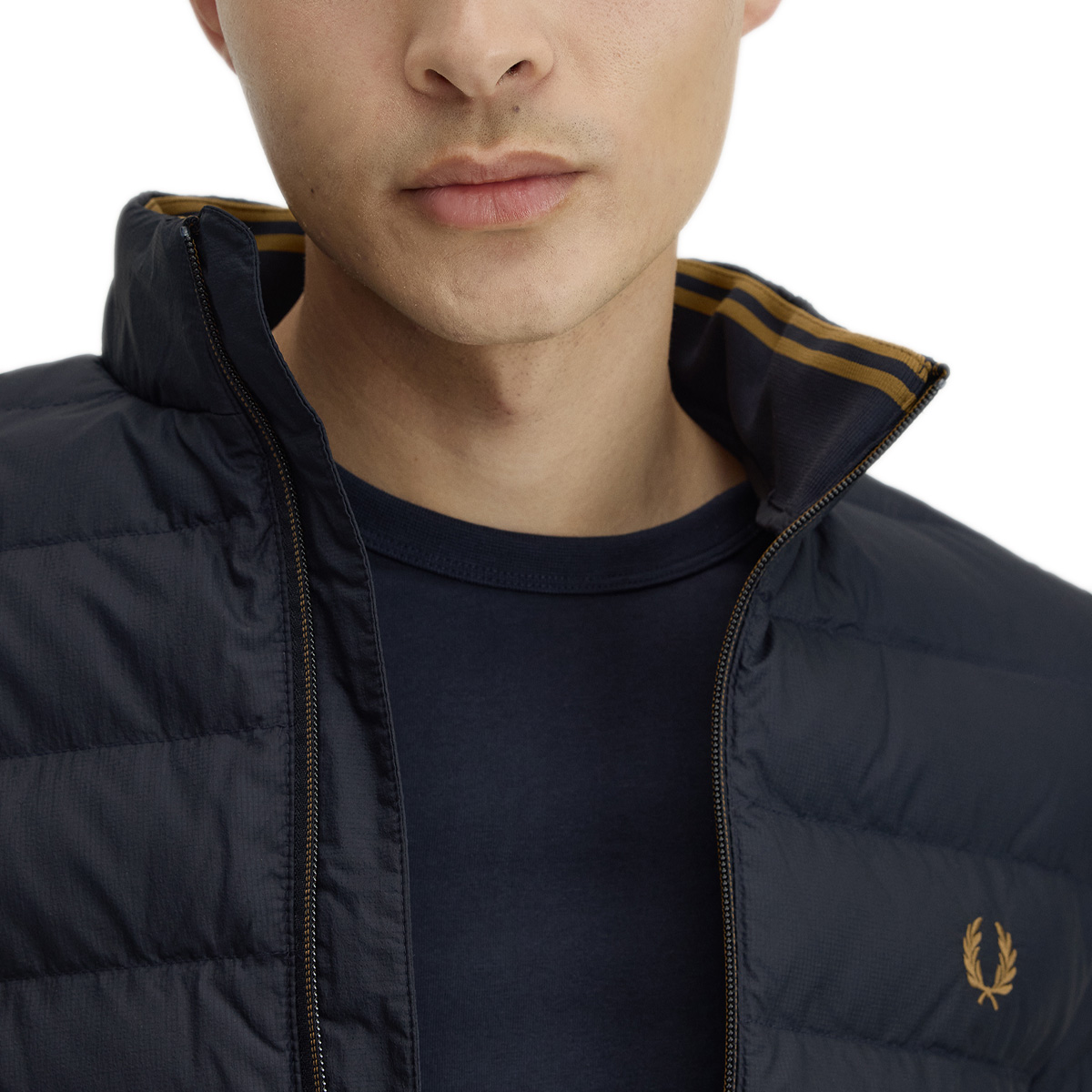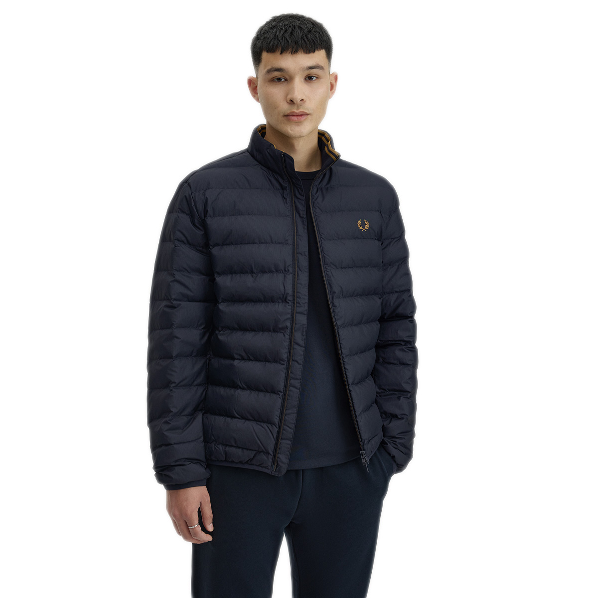 Modelo Fred Perry Insulated Jacket, sendo o azul a cor predominante, conta com o logótipo da marca bordado em bronze.